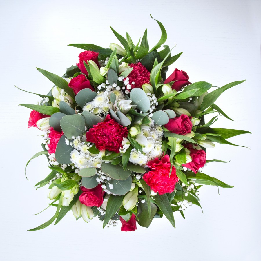 Immerse yourself in the beauty and uniqueness of this stunning bouquet. Featuring a harmonious blend of sweet white chrysanthemums, delicate gypsophila, luxurious red roses, and vibrant carnations, complemented by white alstroemeria and lush aspidistra leaves.